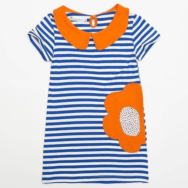 Short Sleeve Striped Rabbit Sunflower Embroidered Dress Blue